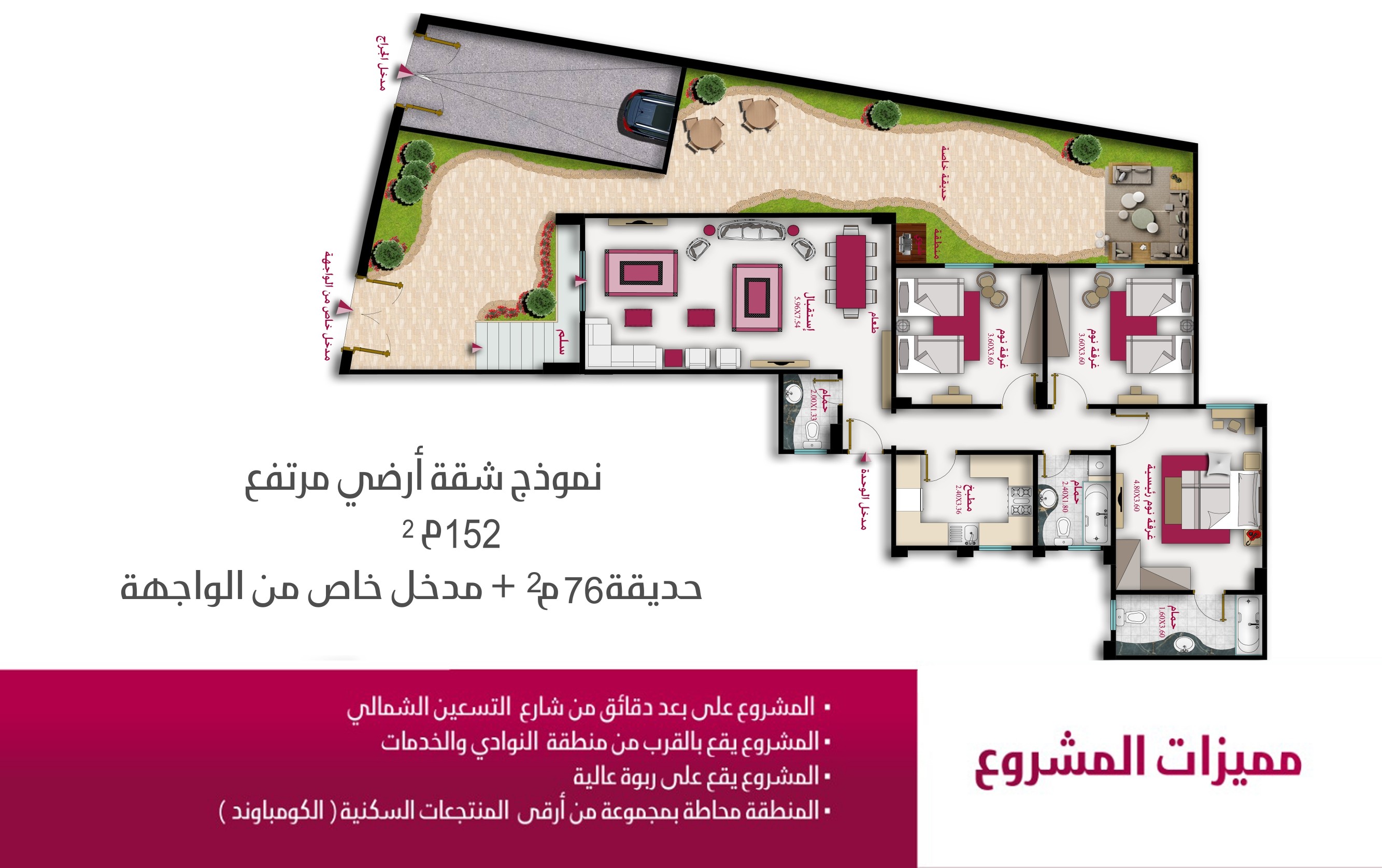 نموذج شقة ارضى مرتفع 152 م2 + حديقة 76 م2